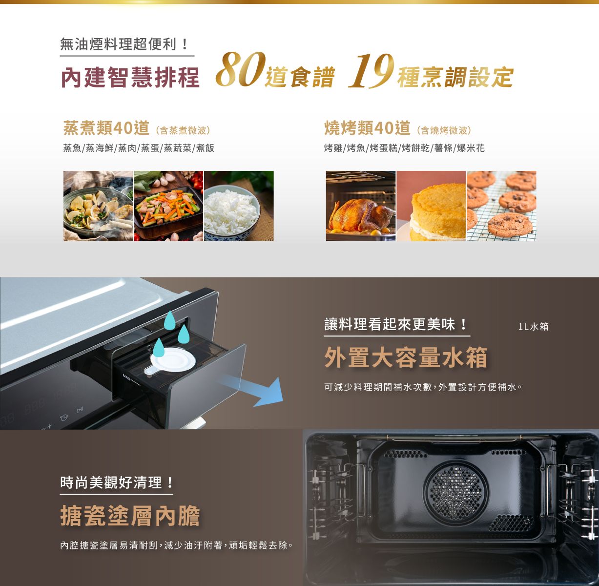 ▪ 「微波+蒸氣+燒烤」三強合一,多種烹調功能設定,打造高級時尚烹飪體驗