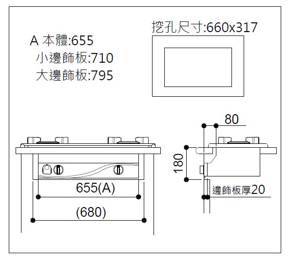 挖孔尺寸 mm W×D 660×317(R0)