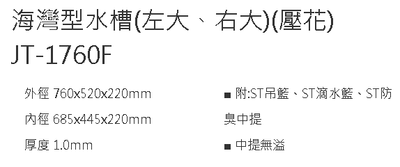 綠廚-傑泰不鏽鋼Jye Tay-JT-1760F-壓花海灣型水槽