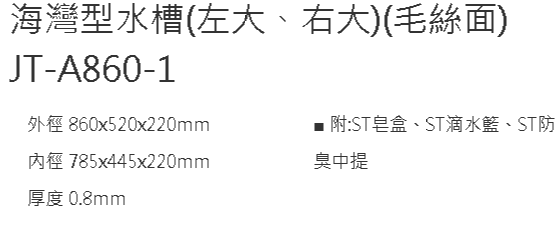 綠廚-傑泰不鏽鋼Jye Tay-JT-A860-1-毛絲面海灣型水槽(只有左大)