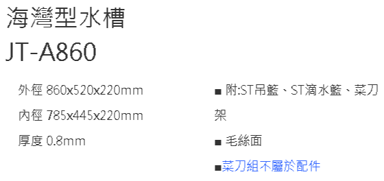 【傑泰不鏽鋼Jye Tay】JT-A860-藝術單槽(只有左大)
